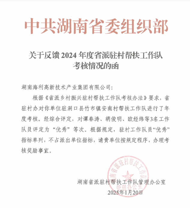 近日,从省派驻村帮扶工作队管理办公室获悉,集团驻洞口县安南村帮扶工作队2024年度以全优佳绩为乡村振兴工作交上满意答卷:工作队考核“好”等次,谭春涛、胡俊明、欧经纬3名工作队员考核“优秀”等次。